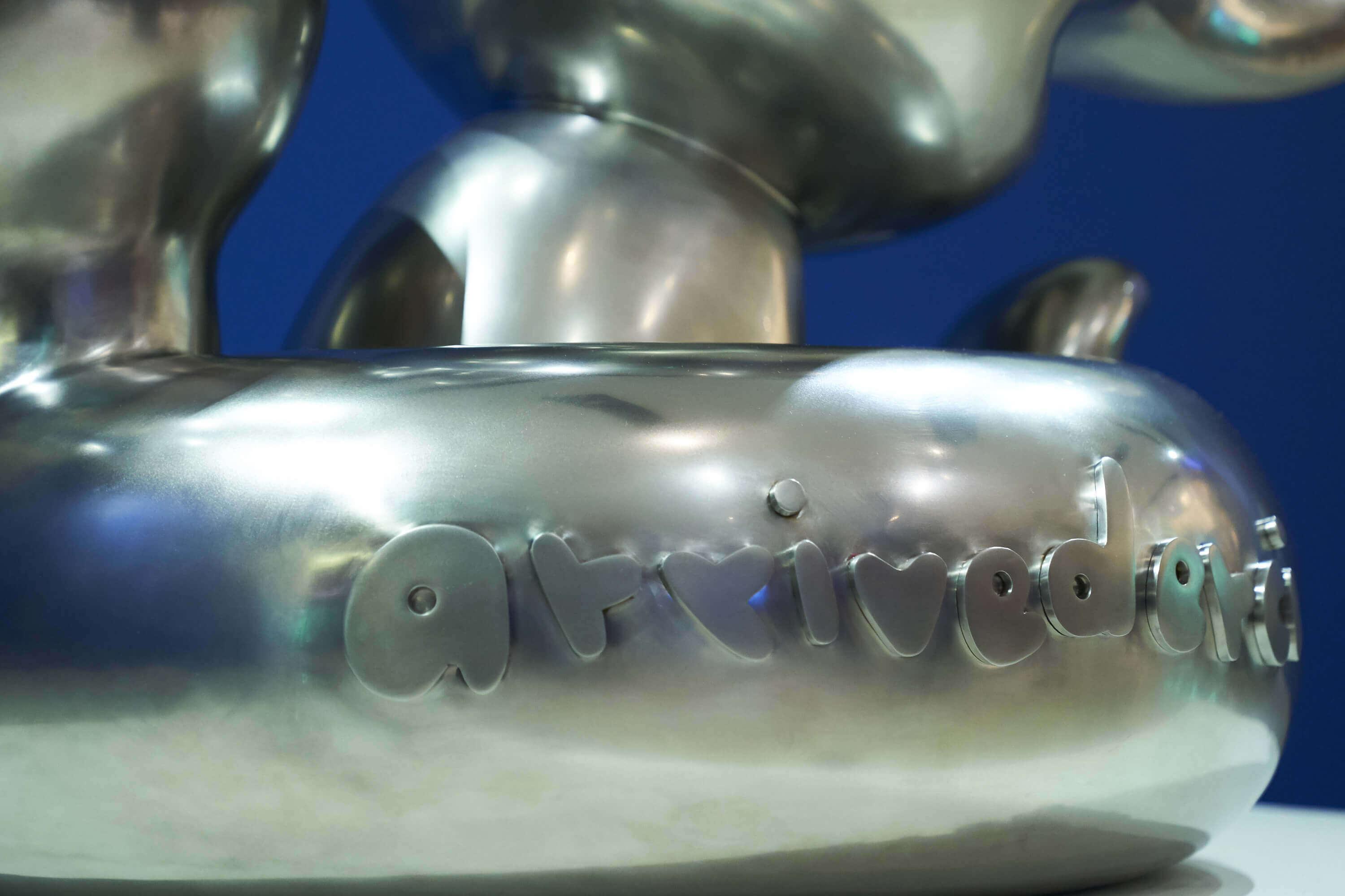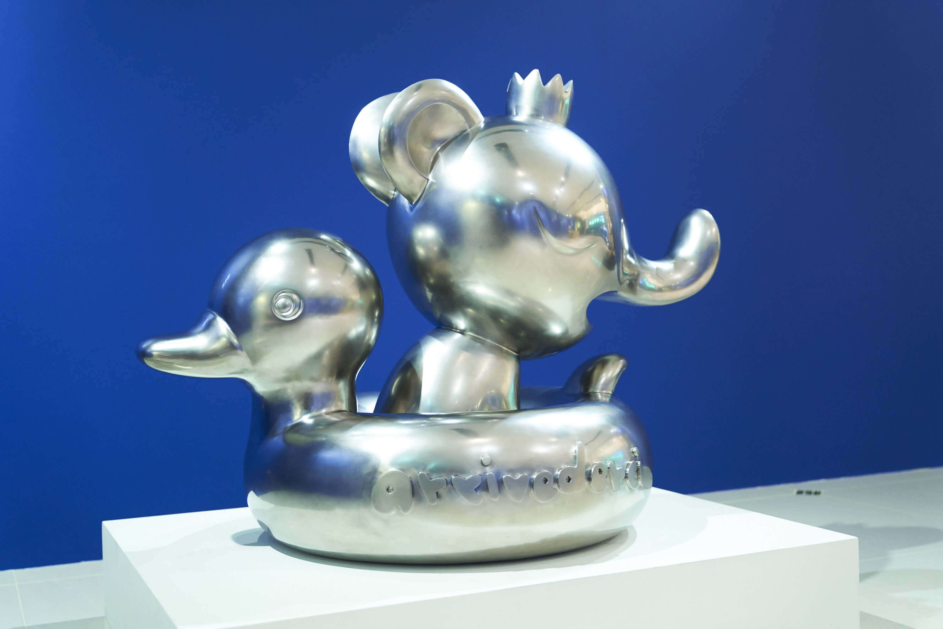 入口另一側的作品,莊雁婷改採不鏽鋼當作媒材,相同角色的小象緊閉雙眼,搭著橡皮泳圈的小鴨,想要快速逃離的想像,側面又借用漫畫《JoJo的奇妙冒險》的其中一位角色,在對戰到最後擊敗對手時,總是會喊「阿哩阿哩阿哩……Arrivederci !」,借用Arrivederci(義大利語:「再見」的意思)道別的意思,暗喻著小象想要逃開的心,已經在游泳圈上有所暗喻。對於莊雁婷的作品來說,從意象又跨進具象的表現上法,在這件不鏽鋼的作品上面,可以看出另一種表現的企圖。