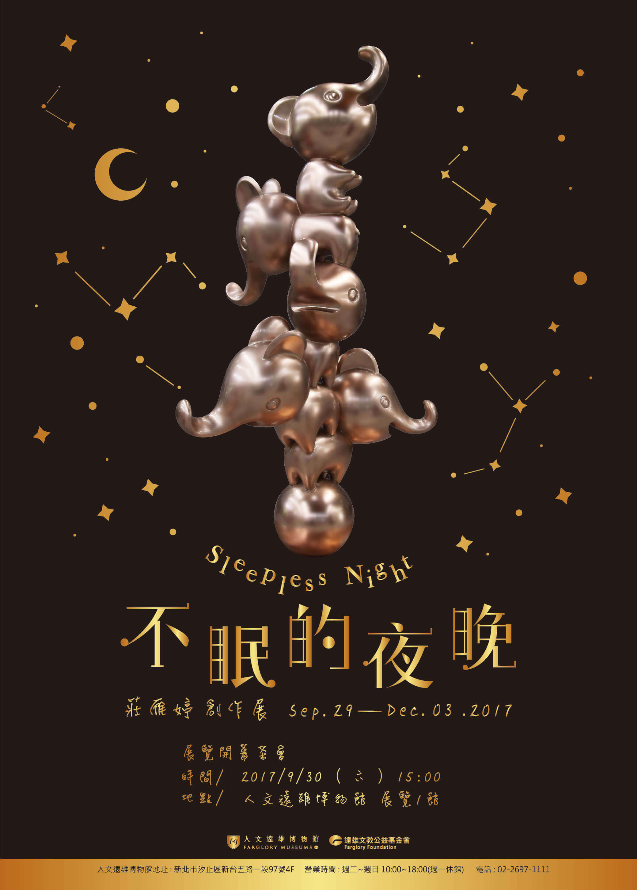 從出生的家中就開始有機會接觸美學,接續著學生時期的基礎及路線修正,出國所帶回來的各式經驗,都像是鐘乳石柱似的點滴累積,這過程當中越堆越高的成分,不只是作品而已,在她創作的路程當中,信心和技術等等無形的資材,都在數十年間慢慢堆疊,到了適當的時間、適當的時機時,那個臨界效應噴發出來的強度,就在這次的《不眠的夜晚》展覽當中,可以看到這一路的軌跡,甚至,對於空間想要表現的畫面,嫻熟的技巧和創作力,牆面化身為一張白紙,銅雕的飛鳥鑲嵌在牆上,彷彿是渾然天成的呈現,這是莊雁婷信手捻來的自信表現。