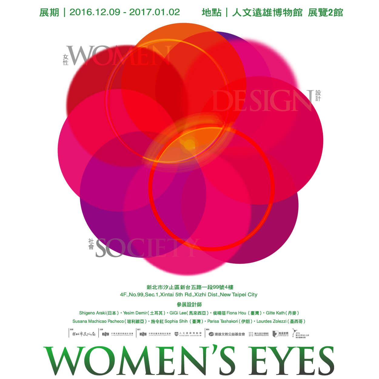 為呼應2016台北設計之都,長期關注藝術與人文的人文遠雄博物館特別攜手中華民國美術設計協會,遴選來自世界各地包括丹麥、馬來西亞、日本、台灣、伊朗、墨西哥、土耳其、玻利維亞等多國女性設計師,集結超過百件設計展品,策劃以女性、設計與社會三者交互關係為焦點訴求的「Women’s eyes-女性X設計X社會」特展。