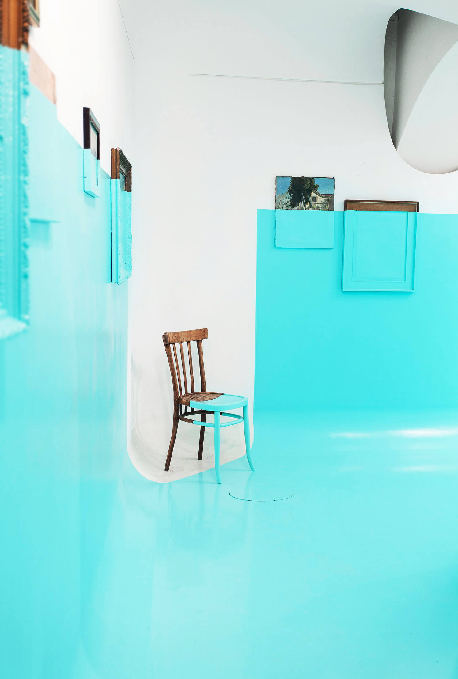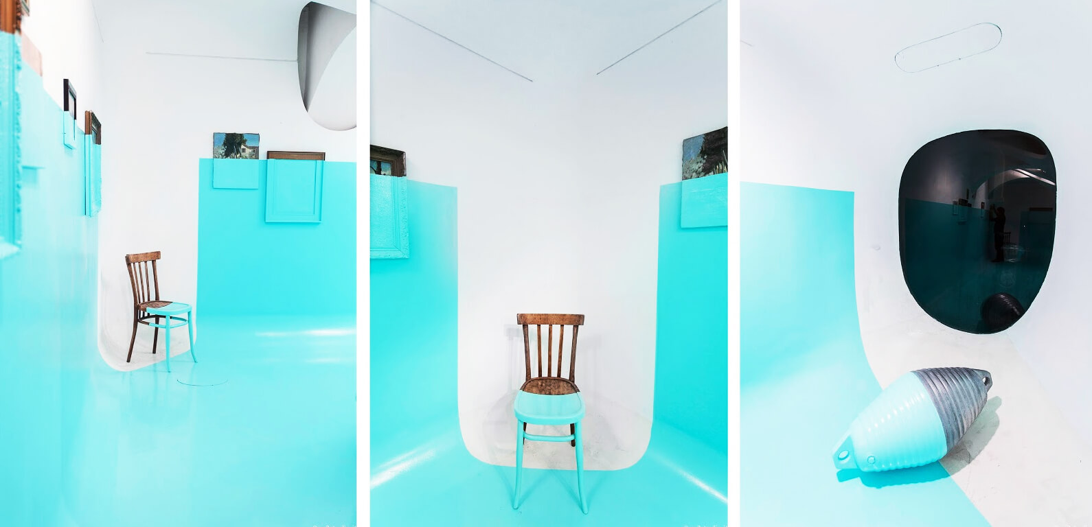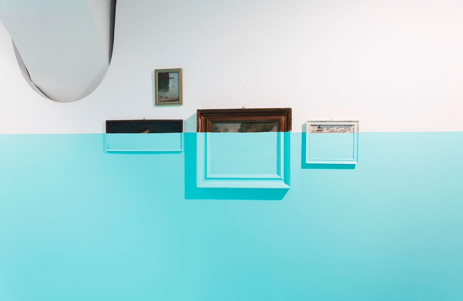 Davide Delia 利用從二手市場取得的19幅畫布 ,一張象徵等待的椅子和一個浮標,表明極限不能穿越。透過〝最永恆的時尚色〞–「Tiffany Blue」顏色的防污漆,將 Ex elettrofonica 畫廊內部地板和牆壁塗滿或保有局部留白,牆上掛著海景、岩石景觀和人物肖像等五花八門的畫作內容,大多是從羅馬的老地窖、跳蚤市場、古董店和垃圾場中淘來的畫,所懸掛的背景牆其顏色從白色突然轉化成藍色,且將畫作本身一塊兒覆蓋、融入。