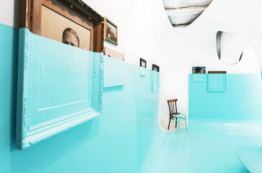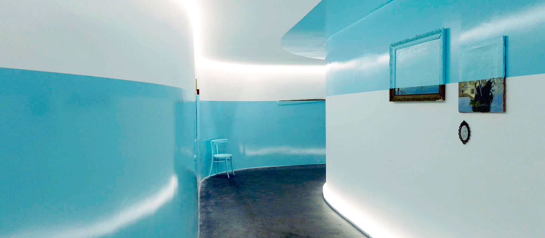 在顏色對比鮮明形成線面的分割比例,形成了一個超現實空間,使之搖身一變宛若沉浸在一片湖水藍色之中,展現出空間裡一種永恆分裂的美,沉浸在一個阻礙時間流動和各種自然過程的深淵。當純凈的天藍色只覆蓋了空間的一半,就像海水在慢慢退潮,時間在一點點流逝,最後回到最初…