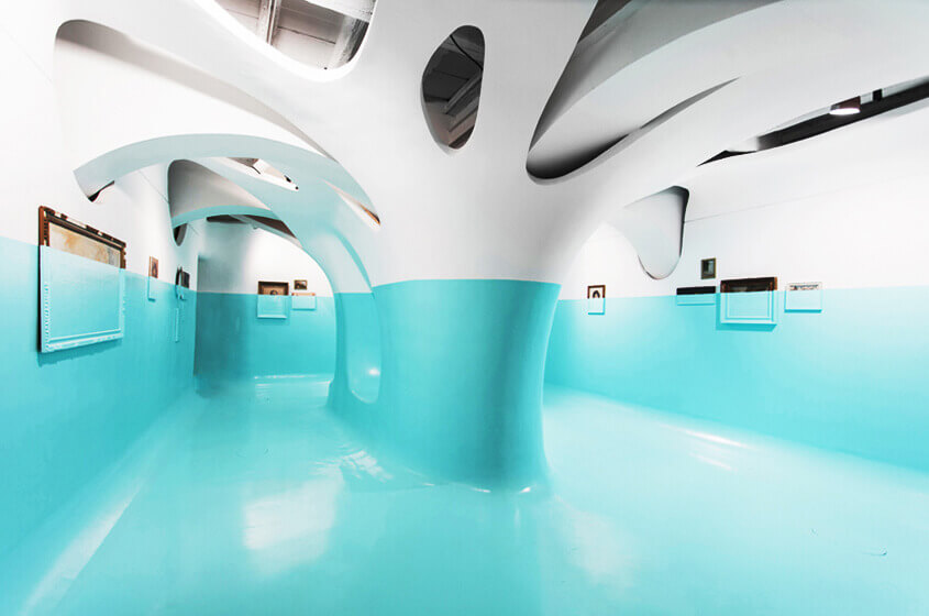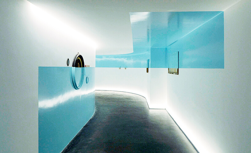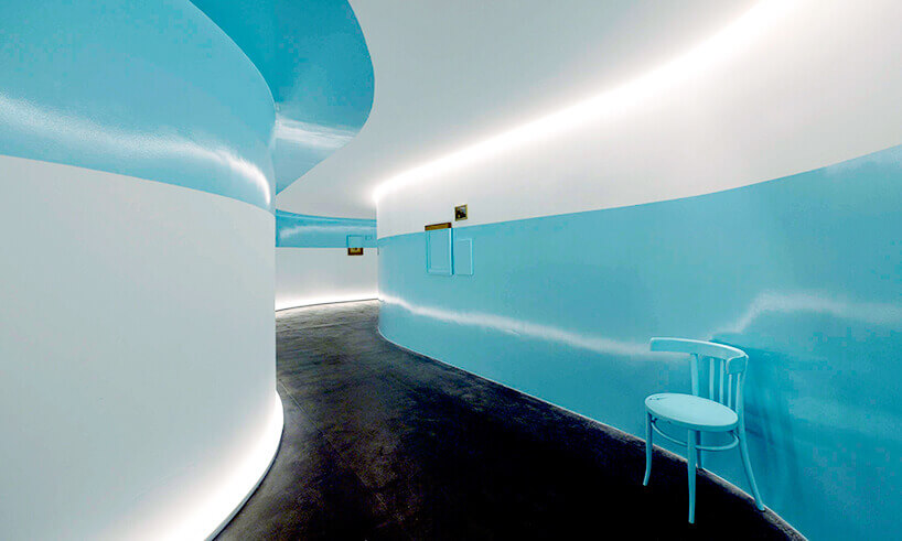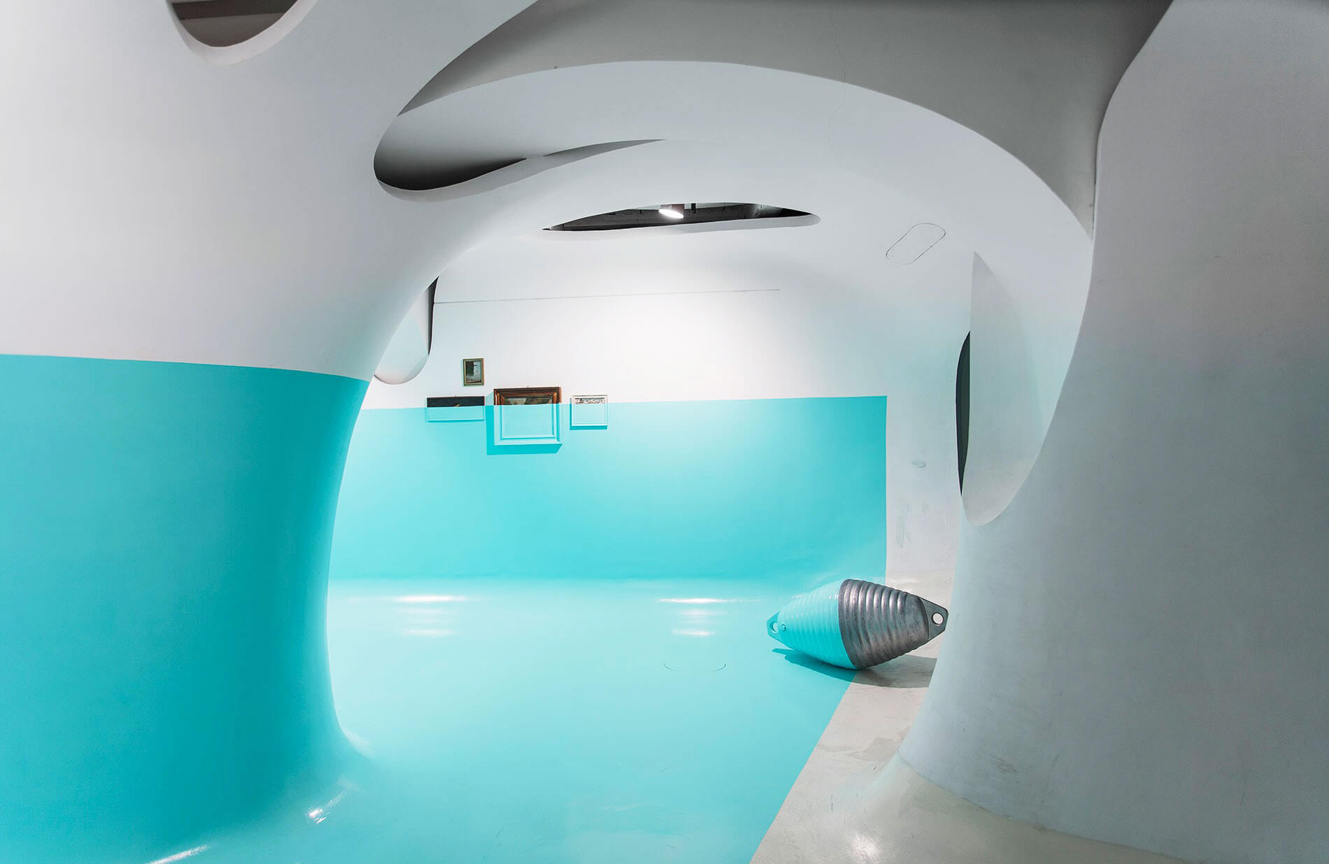 透過Tiffany Blue的防污漆,將 Ex elettrofonica 畫廊內部地板和牆壁塗滿或保有局部留白,圍塑出潛伏海洋之下的船艙意境….。 圖/designboom