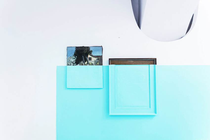 所懸掛的背景牆其顏色從白色突然轉化成藍色,且將畫作本身一塊兒覆蓋、融入。圖/mydesy