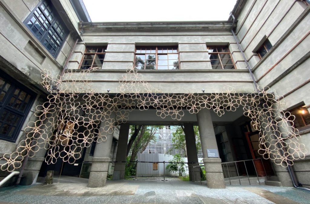 記憶裡的藤花也是傳統技藝的命脈,獨特的藤繞技法,加以堆疊一朵朵人造花形,攀附在松菸南向的空間廊道上,向外拓展象徵無限的生命延續;其柔軟與纏繞的特性,體現藤蔓植物歷經歲月仍毅力不搖的樣態,彷彿跨越森林與城市,同時串連建築與歷史。