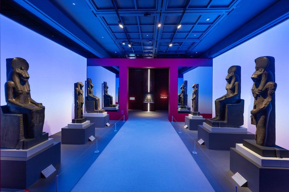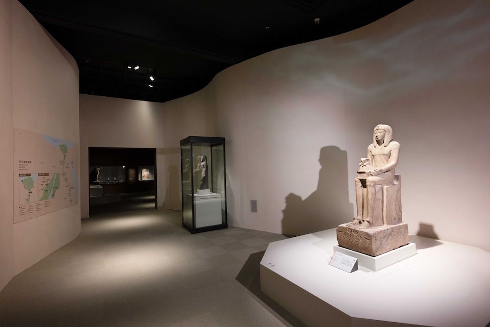 展場空間劃分成七大面向,運用色彩光影、建築語彙與現代配樂,強化觀眾對古埃及法老王權世界的理解。穿越入口廊道、踏進單元一「埃及:法老的國度」馬上就會被潺潺流水聲環抱;塞提二世王權坐像靜靜坐在有如尼羅河蜿蜒曲線的牆面前,搭配水波紋光影,觀眾彷彿行走在埃及的生命之河上,見證法老統治三千年的輝煌歷史。