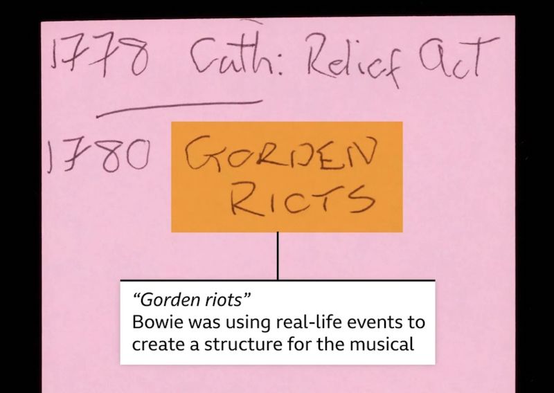 從這些筆記可見,鮑伊對戲劇、諷刺作品的偏愛從未減退。事實上,早年他便深受英國創作歌手暨演員安東尼・紐利(Anthony Newley)的影響,並曾師從默劇大師林賽・肯普(Lindsay Kemp),這些養分奠定了他音樂與舞台表演中強烈的戲劇性。