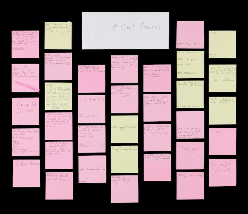 在首展中,最引人注目的亮點正是音樂劇遺作《The Spectator》。展間牆面佈滿鮑伊留下的便條紙,逐一記錄他對該劇的構想與靈感來源,觀者得以直接感受他在工作時的私密狀態與創作節奏。