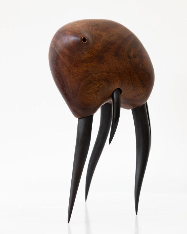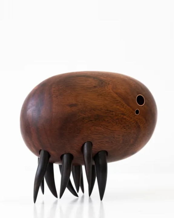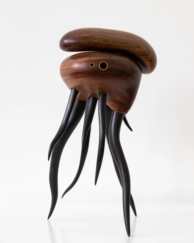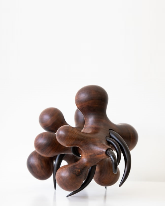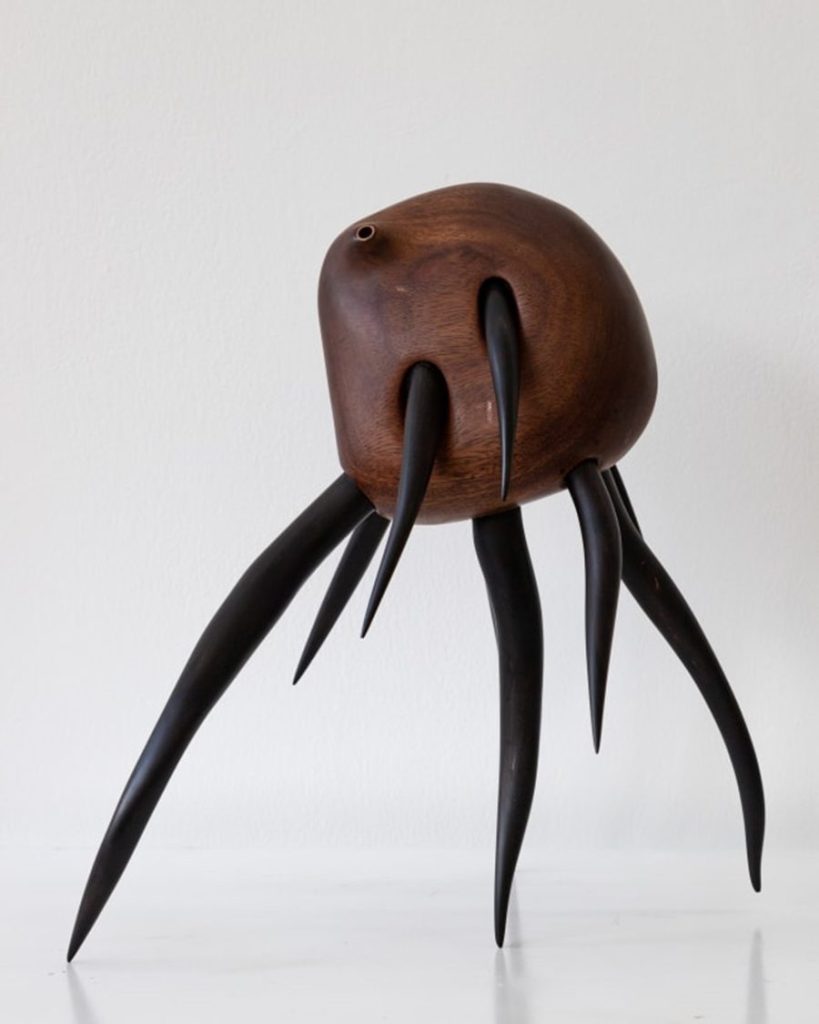 Donald Wasswa 偏愛以合歡木、烏木等有機材質,並將金屬嵌入其中細節,創造出各種大膽且神祕造型生物雕塑,木頭的溫潤與金屬的冰冷、自然與人工之間的微妙揉合,這些神秘生物時而像水母的觸手般在空間中佇立,時而化為不規則的球體或方形突變形體——黑暗與鋒利的觸手觸發觀者在科幻生物與神祕未知之間的感官震盪。