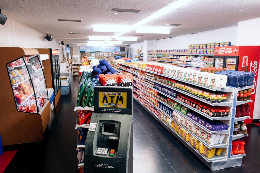 Lucy Sparrow 創作的毛氈作品不僅具象,更透過柔軟與擬人化,賦予許多食物與商品可愛的笑臉表情,像是試圖藉此消弭社會制度下的沉重生活壓力。