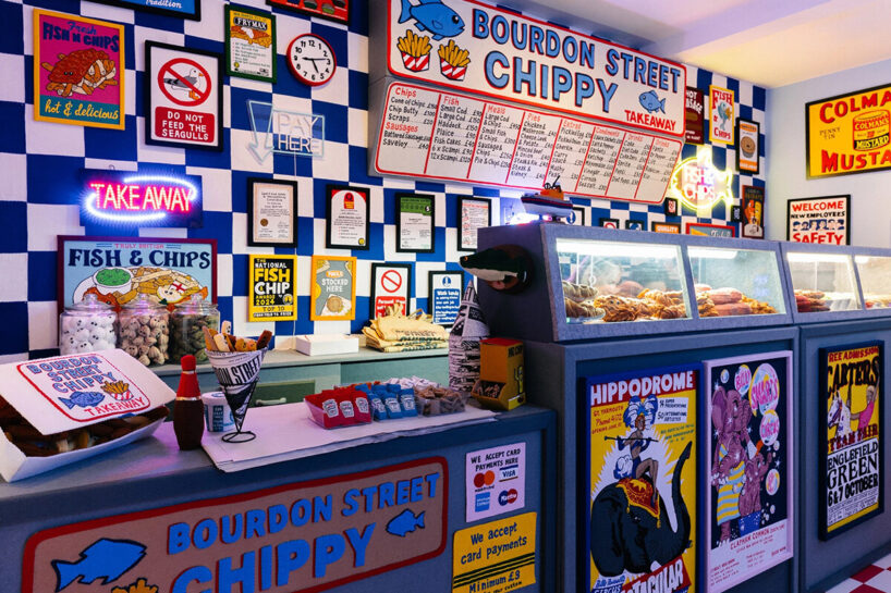 畫廊不只是展示單件作品,而是完整空間策展的實踐,畫廊的每一間展間都被重新構建為炸魚薯條店的不同區域——櫃檯、點餐區、座位長凳、牆上肖像與價目表的安排,皆如實還原傳統英式速食店的視覺與動線設計。