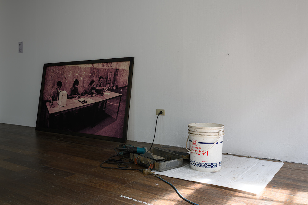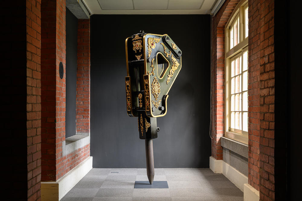 廖建忠《場景—無法繼續的理由》呈現佈展過程中鑽孔誤破水管、使展品上牆被迫中斷的突發狀況;《帝國三七式油壓破碎錘》以塗裝精美與裝飾浮誇的油壓破碎錘,隱喻被體制化、標準化的權力運作歷史。