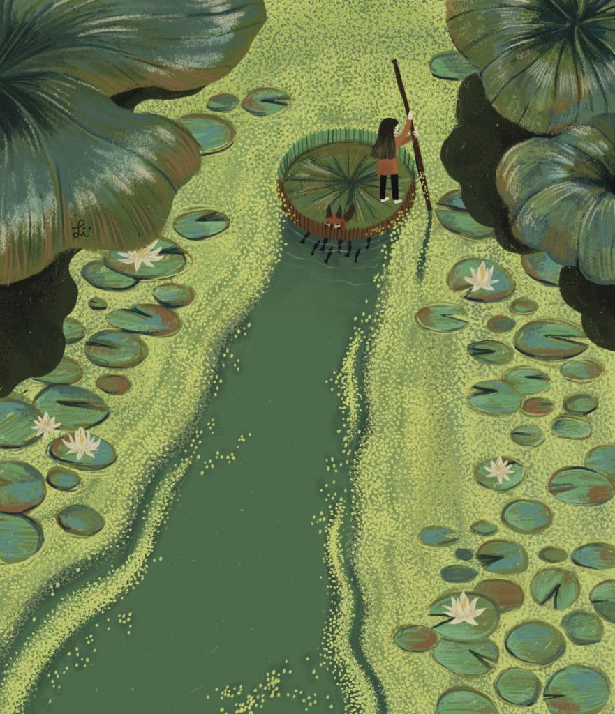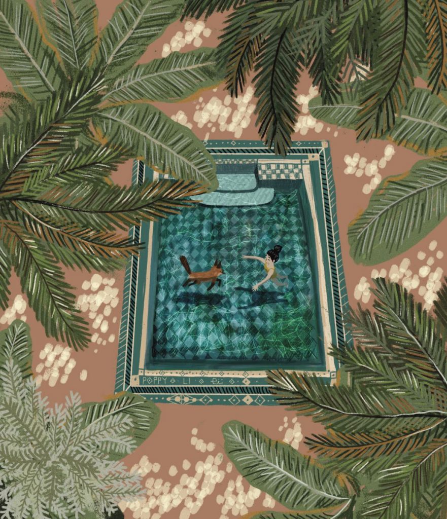Poppy擅長透過角色人物將觀眾與之的目光,聚焦在同一位置,藉此開啟另一道創作思維的延伸。《LILYPAD》畫中的女孩滑著槳劃過水萍佈滿的湖面,船的運動方向直接鎖定觀者視角,讓人一眼看見魚兒和狐狸的對話。