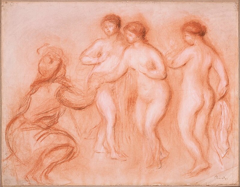 前者顯示雷諾瓦逐漸從印象派語彙中抽離,探索更具體的造型與結構;後者則為其與雕塑家理查・吉諾合作的雕塑案草圖,以粉筆細緻描繪古典神話場景中的肢體動作與律動安排。