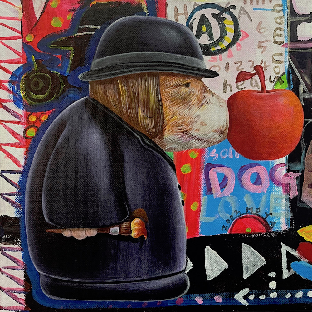 他也常將狗狗、貓咪與蘋果放入人們熟悉的名畫構圖中,讓觀眾在第一眼就產生既視感。無論是借用《人子》或《維納斯的誕生》的畫面結構,經過動物角色的轉換後,原本帶有距離感的經典形象,變得更親近也更輕鬆。這些作品不需要額外說明,觀眾自然能理解其中的幽默與改寫,也更容易進入邊尚鎬所打造的想像世界。