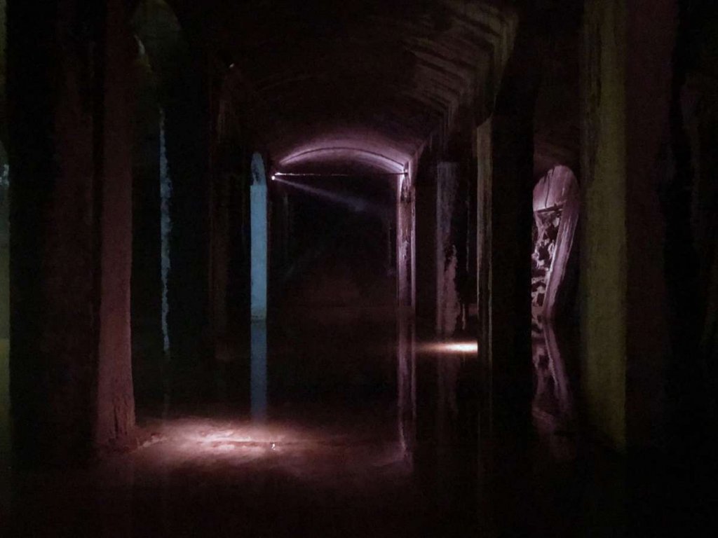草坪上有兩座玻璃金字塔為The Cisterns的入口標誌,進入朝下走,也逐漸開啟前所未有的黑暗寒冷之慄。濕度幾乎為100%、持續的水流、17秒的廻聲、完全沒有日照,這就是The Cisterns的日常。偌大的空間,由三個蓄水池室組成,4.2米高,堅硬的花崗岩砌塊牆壁與神秘的氛圍,仿若是古墓奇兵的寶地或是被遺棄的古老大教堂場域。
