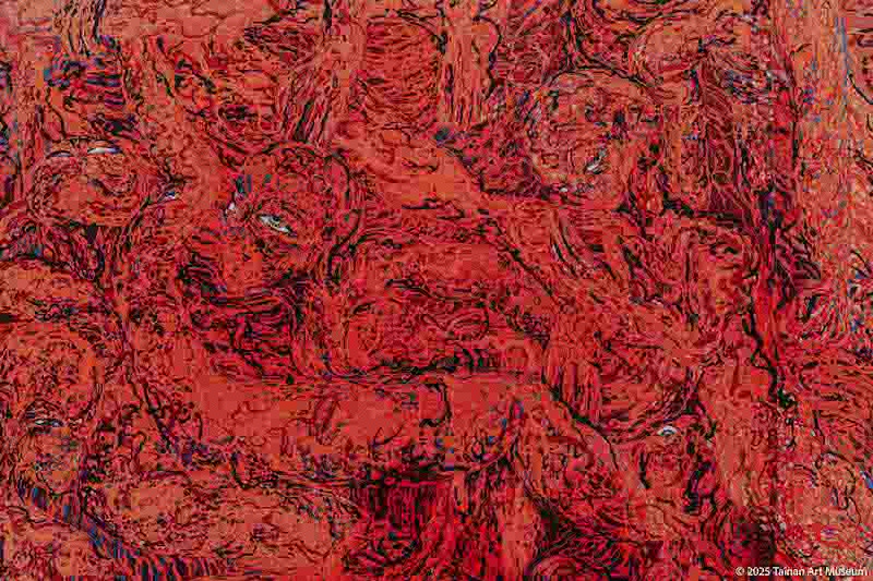 在大廳大廳即能以本件色彩鮮明、張力十足的作品,感受到本展的震撼!山下茜里擅長將傳統蠟染技法,融入現代藝術語彙中。作品剝除皮膚的表象,以鮮烈色彩描繪人類身體裡的血管、肌肉、器官,探問「人」的本質。