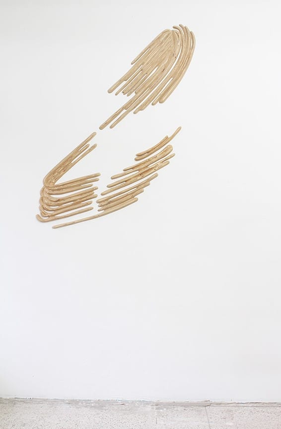 特別值得一提的是立體雕塑上層疊的紙漿,其原料是Flad收集的大量藝術評論、報章雜誌,全部絞碎後再糊在彎曲的木料上。處理完成後,你再也無法從作品上讀出一字一句。但那原本乘載著無數藝術資訊的文本,已全數化為木料的覆蓋物,安靜地回歸紙類的原型——樹木。