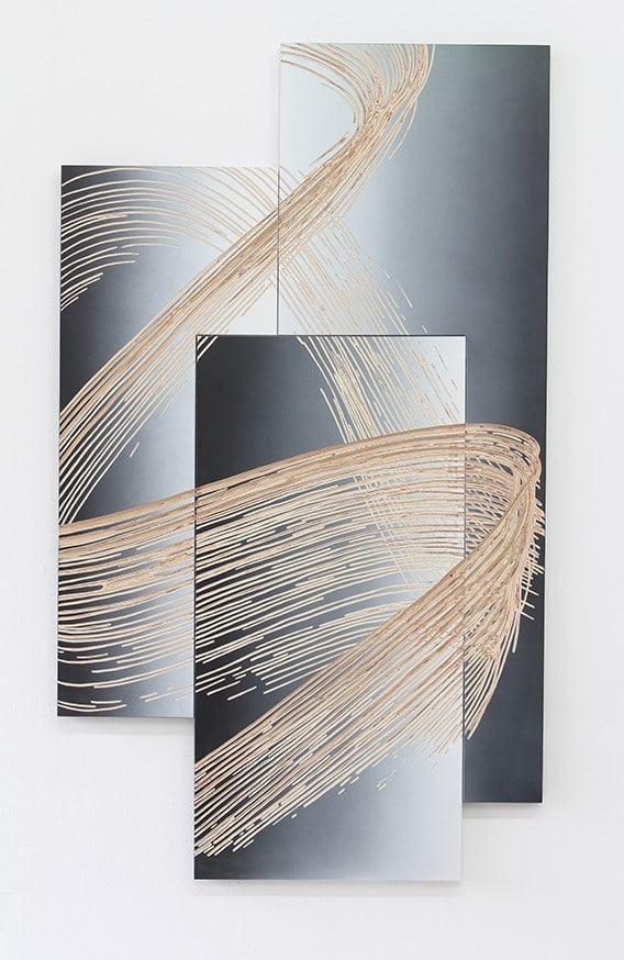 但那些流動形的浮雕就不同了,Flad做這系列浮雕會先噴漆,上了七、八層漆之後,再集中大量精力,專心地刻出精準的線條。相較之下,在木板上的刻痕就像畫筆在平面上描繪,基本上是把腦海裡的畫面,像書寫一樣刻印到現實之中。