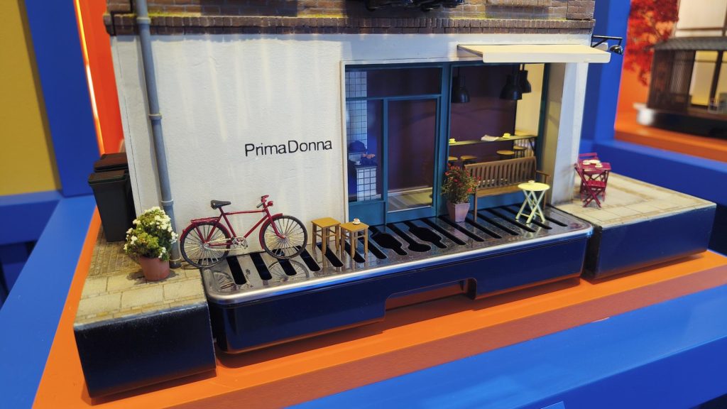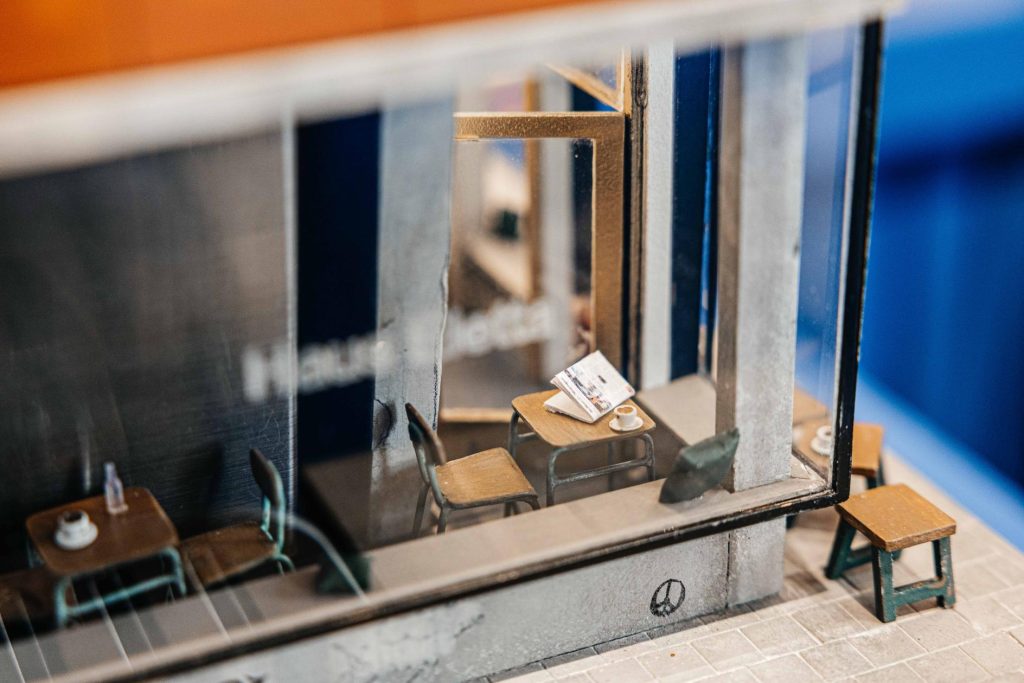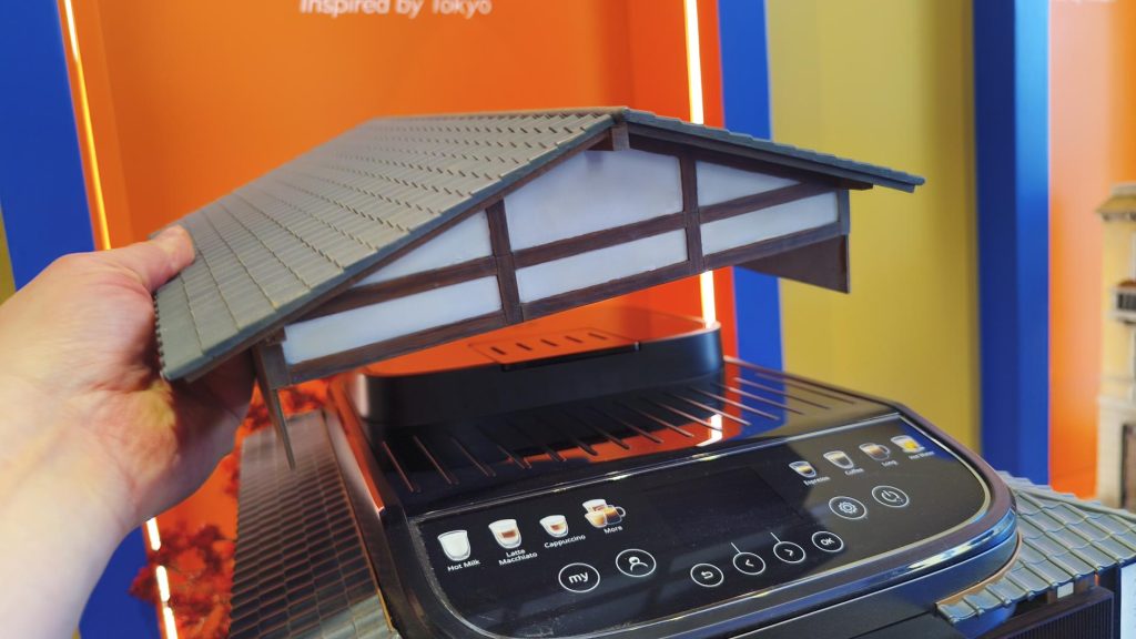 與電影模型不同的是,這些作品並不是只為鏡頭而存在。電影場景往往只需呈現單一視角,但在展覽現場,觀眾可以從四個方向觀看模型,因此所有細節都必須完整呈現。更特別的是,模型中的咖啡機仍然能夠實際運作:加水、萃取咖啡、蒸氣運作都維持正常功能。像巴黎模型的屋頂就設計成可掀開的結構,方便補水與操作。